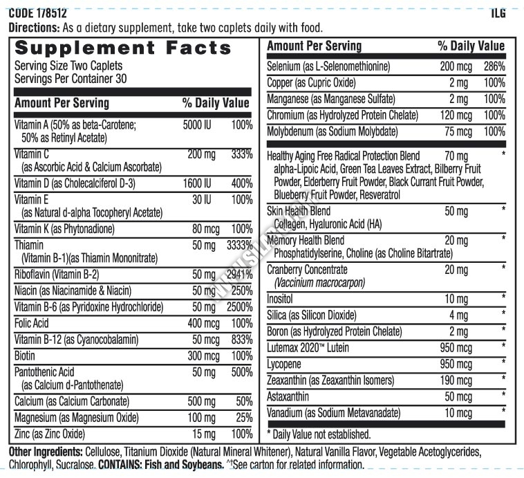 Витамин В12 (цианкобаламин), Биотин, калций, желязо, йод, магнезий, селен, цинк, мед, манган, хром, молибден, Цитрусов биофлавоноиден комплекс, портокал на прах, папая на прах, моркови на прах, спанак на прах, ананас на прах, соя на прах, карфиол на прах, боровинки на прах, бъзи на прах, стафиди на прах, боровинка на прах, ябълка на прах, прах от сърцевината на грозде, киви на прах, малини на прах, броколи на прах, брюкселско зеле на прах, къдраво зеле на прах, алфа липоева киселина, холин, инозитол, екстракт от зелен чай, екстракт от червена боровинка - концентрат, ликопен, лутеин, Зеаксантин, Астаксантин