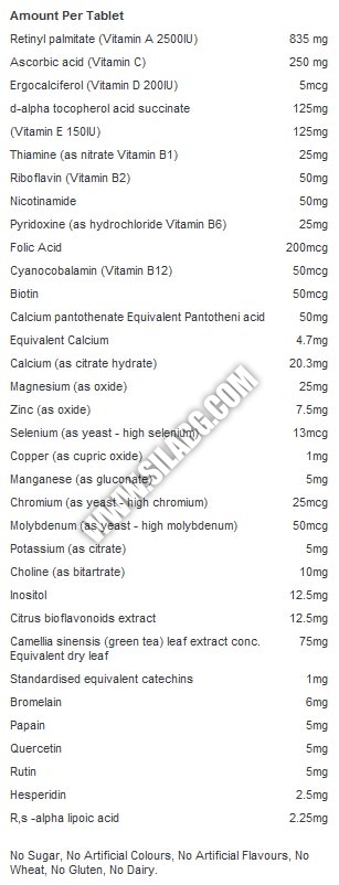 Съставки: Витамин А, витамин С, витамин Е, витамин D, витамин В1, витамин В2, ниацин, витамин В6, витамин В9, витамин В12, биотин, калций, желязо, йод, магнезий, селен, цинк, мед, манган, хром, калий, бор, холин, инозитол, рутин, Триметилглицин, Цитрусов биофлавоноиден комплекс, Хеспердинов комплекс, Кверцетин дихидрат, липаза, амилаза, протеаза, целулаза, ликопен, алфа-липоева киселина, зелен чай - екстракт от листа