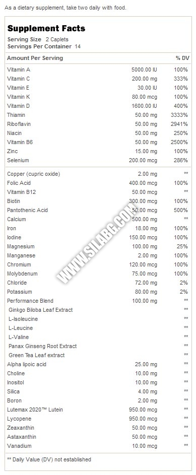 Съставки: Витамин А (50% бета-каротен, Витамин С, Витамин D (холекалциферол, Витамин Е, Витамин К (фитонадион), Витамин В1, Витамин В2, Ниацин (ниацинамид, ниацин), Витамин В6 (пиридоксин хидрохлорид), Витамин В9 (фолиева киселина), Витамин В12 (цианкобаламин), Биотин, Пантотенова киселина, (кациев d-пантотенат), Калций, Желязо, Йод (калиев йодид), Магнезий (магнезиев оксид), Цинк (цинков оксид), Селен (хидролизиран протеинов хелат), Мед (меден глицинат),Манган (манганов сулфат), Хром (хромов пиколинат), Молибден (натриев молибдат), Хлор (калиев хлорид), Калий (калиев хлорид), корейски женшен, екстракт от Гинко Билоба, екстракт от листа на зелен чай, L-валин, L-левцин, L-изолевцин, Алфа-липоева киселина, Холин, Инозитол, Боровинков концентрат, Силиций, Лутеин, Ликопен, Бор (натриев борат), Астаксантин, Зеаксантин, Ванадий