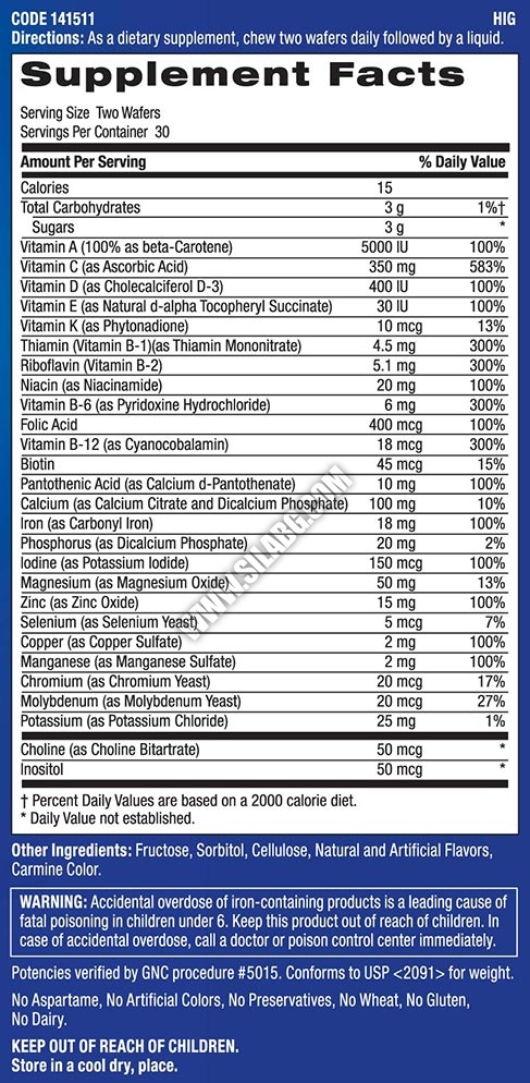 GNC Mega Teen Multivitamin съдържа витамин A, силен имуностимулатор, който подобрява обмяната на веществата. Витамин A е силен антиоксидант, който предпазва организма от негативните влияния на околната среда. Витамин B комплекс подпомага нормалното протичане на обменните процеси в организма и има общо тонизиращо действие. Той действа благоприятно върху функциите на черния дроб и нервната система.