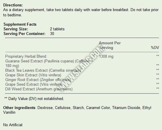 Съставки: Екстракт от семена на Гуарана, Екстракт от черен чай, Eкстракт от ципи на грозде (грозде) , Екстракт от корен на джинджифил, Екстракт от семена на грозде, Екстракт от копър