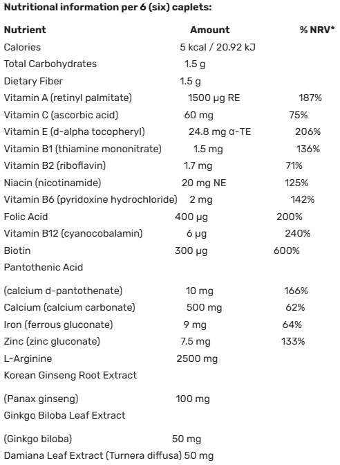 Билоба подобряват периферното кръообръщение. Дамяна е ароматна билка, с разностранни полезни ефекти, витамини А, С и Е са важни антиоксиданти, витамините от група В са важни за нормалната активност на голям брой ензими и участват в енергийния метаболизъм. Калцият е важен елемент за костите, особено за женския организъм, желязото участва в енергиния обмен на клетките и е важен за работата на мускулите. Цинкът също учатства в голям брой метаболитни процеси, като изключително важна е ролята му в репродуктивната функция.