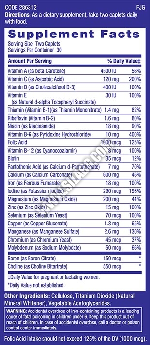 Съставки: витамин А, витамин Е, виамин В12, витамин В6, витамин В12, витамин В2, желязо, цинк, селен, магнеий, ниацин, калций, хром, биотин, калий