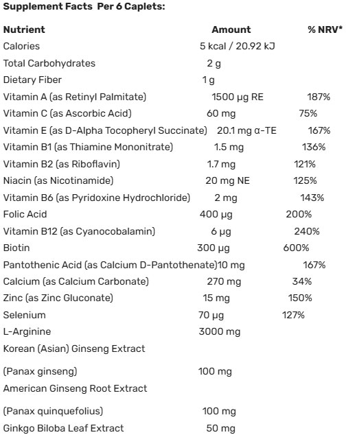 Съставки: витамин А, витамин С, витамин Е, витамин В6, витамин В12, витамин D, цинк, селен, корейски женшен - екстракт, гинко билоба, л-аргинин, биотин, ниацин, рибофлавин
