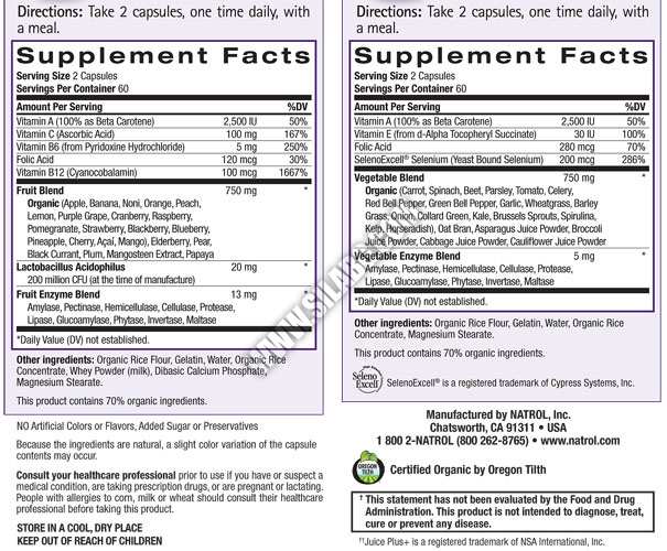 This formula combines Vitamin A (Beta Carotene), Vitamin C, B Vitamins (B6, B12, Folic Acid), and Selenium to support immune function and protect cells from oxidative stress. The Organic Fruit Blend and Vegetable Blend provide additional antioxidants and phytonutrients. The Fruit Enzyme Blend and Vegetable Enzyme Blend support digestive comfort and nutrient absorption.