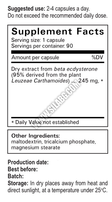 Ingredients: Beta-ecdysterone (from Leuzea carthamoides extract, 95%), maltodextrin, tricalcium phosphate, magnesium stearate