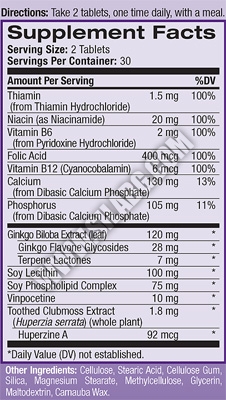 Thiamin (vitamin B1), niacin, vitamin B6, folic acid, vitamin B12, calcium (dibasic calcium phosphate), Ginkgo Biloba extract (leaf), Ginkgo flavone glycosides, terpene lactones, soy lecithin, soy phospholipid complex, vinpocetine, tooted clubmoss extract (Huperzia serrata) containing huperzine A.