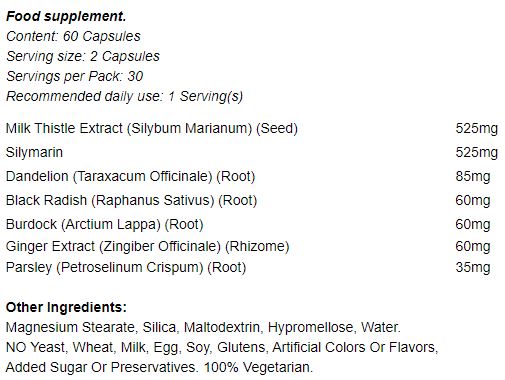 Milk Thistle Extract (Silybum marianum) seed, Dandelion (Taraxacum officinale) root, Black Radish (Raphanus sativus) root, Burdock (Arctium lappa) root, Ginger Extract (Zingiber officinale) rhizome, Parsley (Petroselinum crispum) root.