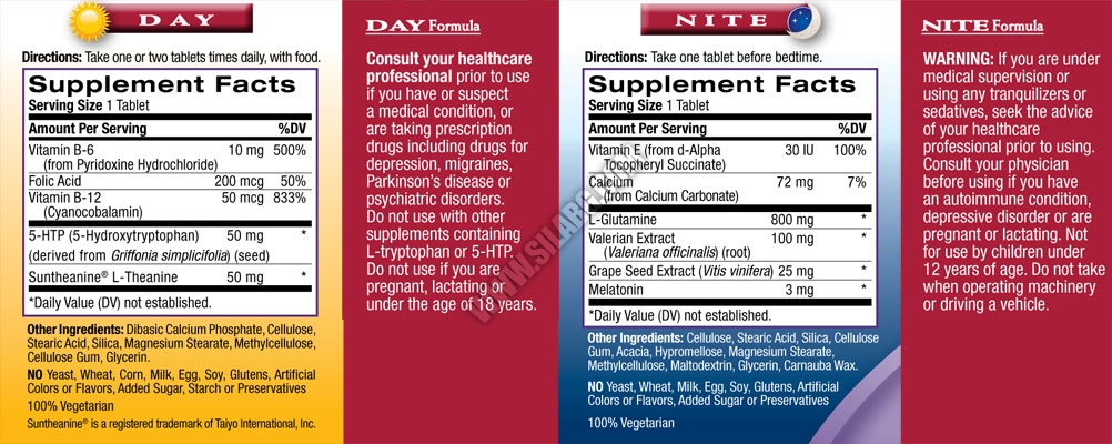 Day formula contains vitamin B6, folic acid, vitamin B12, 5-HTP, and Suntheanine® L-Theanine for stress relief and mood balance