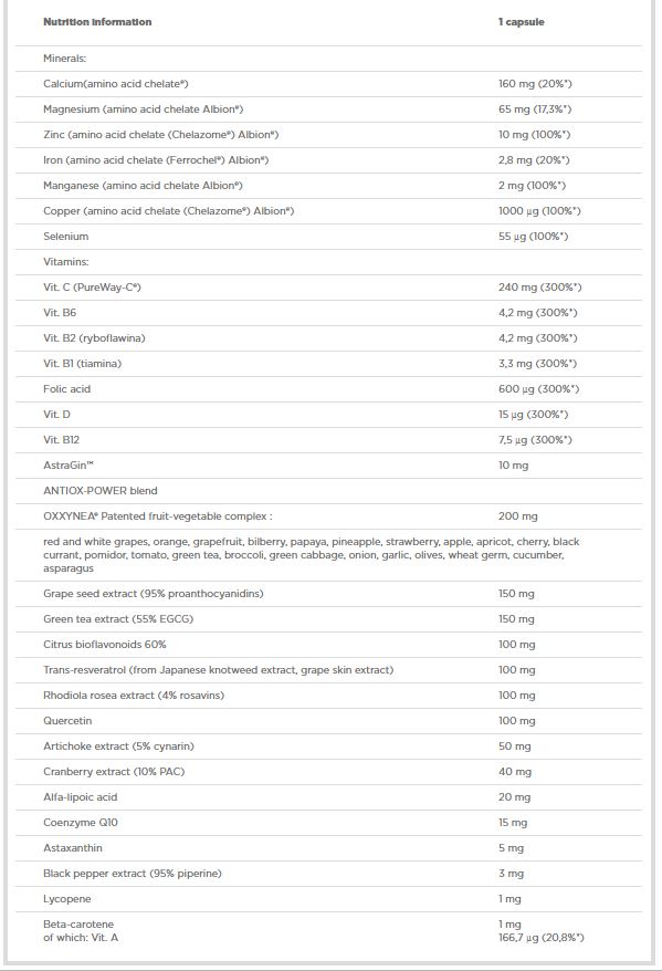 Gold-Vitamin Antiox Super Sport from Olimp is a multivitamin and antioxidant complex developed to support active individuals under oxidative stress and high physical demands.