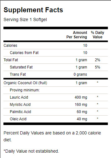 Ingredients: Organic Coconut Oil (fruit), Softgel Capsule (gelatin, glycerin, purified water)