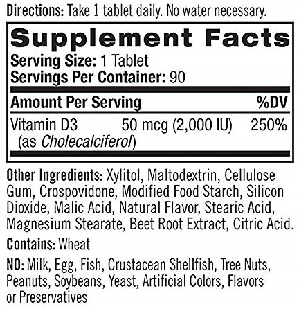 Provides 2,000 IU (50 mcg) of vitamin D3 per tablet