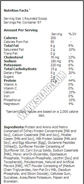 Ingredients: Protein Matrix Comprised of (Whey Protein Concentrate, Whey Protein Isolate, Calcium Caseinate, Micellar Casein, Milk Protein Isolate, Egg Albumen, and Glutamine Peptides), Sunflower Powder (Sunflower Oil, Corn Syrup Solids, Sodium Caseinate, Mono- & Di-Glycerides, Dipotassium Phosphate, Tricalcium Phosphate, Soy Lecithin, and Tocopherols), Polydextrose, Cocoa Powder Processed with Alkali, Natural & Artificial Flavors, MCT Powder (Medium Chain Triglycerides, Non-Fat Dry Milk, Disodium Phosphate, and Silicon Dioxide), Lecithin, Salt, Cellulose Gum, Acesulfame Potassium, Sucralose, Papain, Bromelain.
