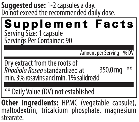 Ingredients: Rhodiola rosea extract (root) min. 3% rosavins, 1% salidroside)