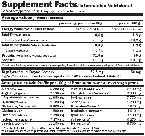 ® - Cross Flow Microfiltered Whey Protein Isolate /from milk/ with protein fractions (Beta-Lactoglobulin, Alfa-Lactoglobulin, Bovine Serum Albumin, Immunoglobulin, Glycomacropeptide, Lactoferrin, Lactoperoxidase), cocoa powder (only in chocolate flavours and cookies cream flavour), aroma, stabilizers: xanthan and guar gum; emulsifier: soya lecithin; dye: (pinacolada flavour: beetroot extract and curcumin; banana flavour: curcumin; strawberry and forest fruits flavour: beetroot extract; apple&cinnamon and pistachios flavour: copper complexes of chlorophyll; patented digestive enzyme DigeZyme