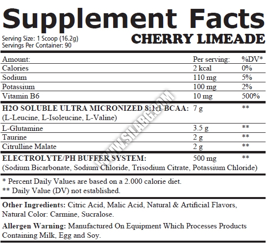 L-Leucine, L-Isoleucine, L-Valine, L-Glutamine, Taurine, Citruline Malate, Sodium Bicarbonate, Sodium Chloride, Trisodium Citrate, Potassium Chloride, Citric Acid, Malic Acid, Natural & Artificial Flavors, Surcalose, Natural Color.