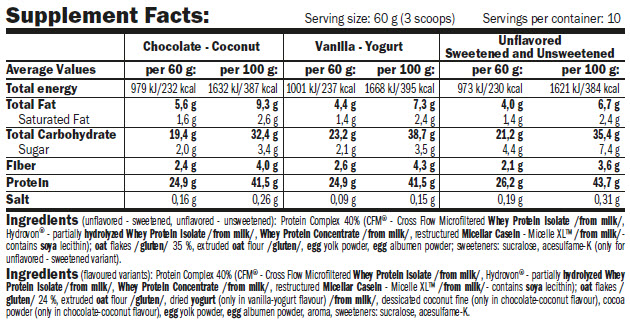 Oat flour, whey protein concentrate, milk protein isolate, whey protein isolate, flavorings, sweetener.