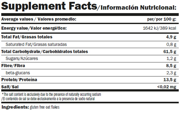 These oat flakes are made from gluten-free whole grain oats, which are a rich source of complex carbohydrates, helping maintain stable energy levels throughout the day. They contain fiber, which supports healthy digestion, and are also a natural source of protein, contributing to muscle maintenance. Their low sugar content and slow-digesting nature make them suitable for athletes and active individuals looking for a clean carbohydrate source.