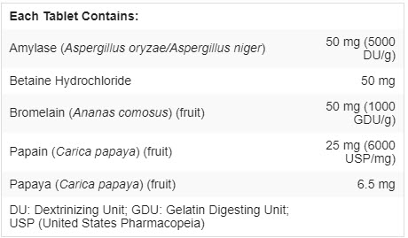 Ingredients: Amylase (Aspergillus oryzae/Aspergillus niger), Betaine Hydrochloride, Bromelain (Ananas comosus) fruit, Papain (Carica papaya) fruit, Papaya (Carica papaya) fruit