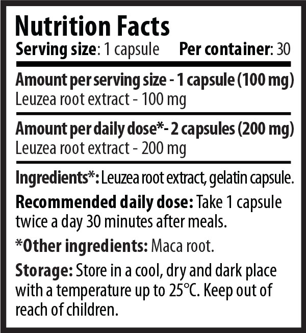 Leuzea from Cvetita Herbal is a new generation high-concentrated extract. Ecdysterone which are included in the product are lookalike some steroid products, but of course, with no side effects. This product accelerates the metabolism, promotes protein synthesis and helps burning fat.