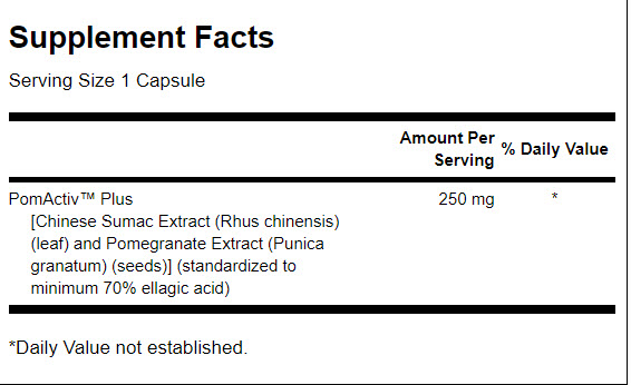 Ingredients: PomActiv™ Plus [Chinese Sumac Extract (Rhus chinensis) (leaf), Pomegranate Extract (Punica granatum) (seeds)] (standardized to minimum 70% ellagic acid)