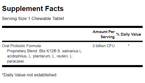Ingredients: BLIS K12® (S. salivarius), L. acidophilus, L. plantarum, L. reuteri, L. paracasei – 3 billion CFU