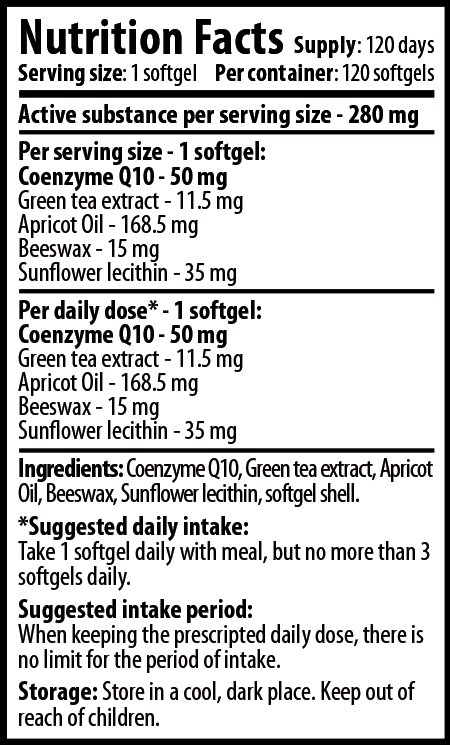 Coenzyme CoQ10 is extremely important for producing energy in the organism. Helps mitochondria and for the faster producing of energy in cells and in this way promotes cell health.