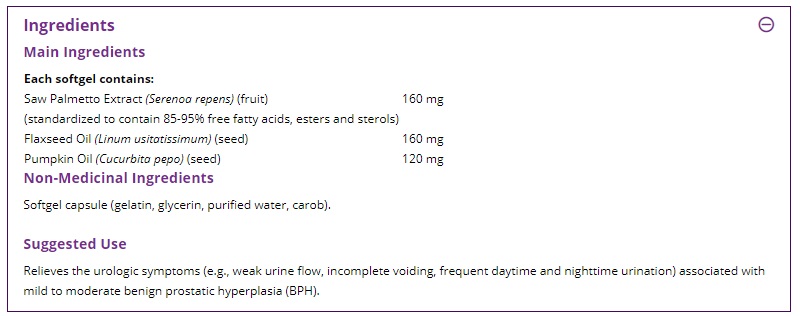 Suggested use: Take 1 softgel daily to relieve urologic symptoms associated with mild to moderate benign prostatic hyperplasia (BPH).