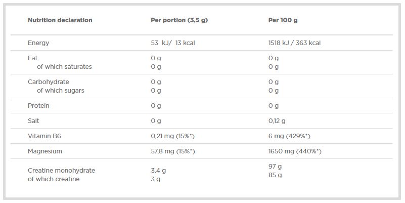 Creatine monohydrate, Vitamin B6, Magnesium.