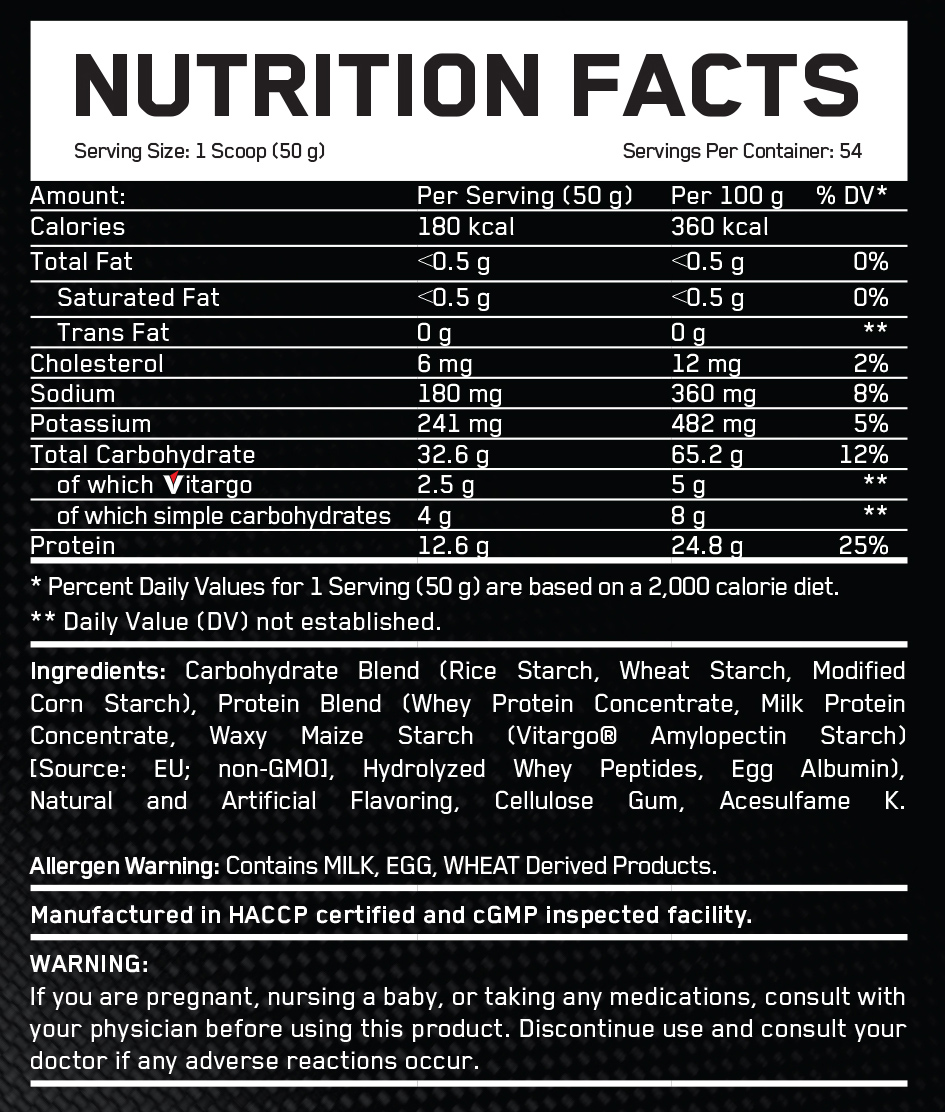 Ingredients: Carbohydrate blend (rice starch, wheat starch, modified corn starch), protein blend (whey protein concentrate, milk protein concentrate, waxy maize starch [Vitargo® amylopectin starch], hydrolyzed whey peptides, egg albumin), natural and artificial flavoring, cellulose gum, acesulfame K