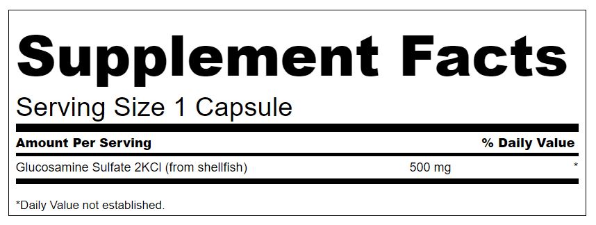 Ingredients: Glucosamine sulfate 2KCl (from shellfish), gelatin capsule.