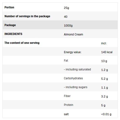 This product is primarily made of almond cream, delivering healthy fats that support energy and cellular health. It also provides protein and fiber, contributing to satiety and digestive comfort. The low sugar and salt content make it a wholesome choice for balanced nutrition.
