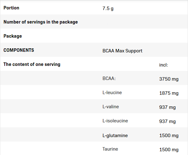 Ingredients: BCAA Max Support complex including BCAAs, L-leucine, L-valine, L-isoleucine, L-glutamine, taurine.