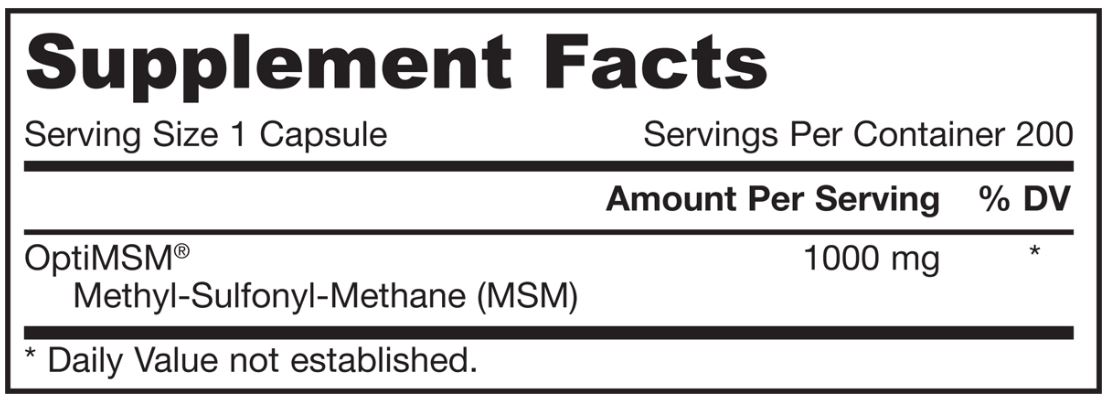 MSM (Methyl-Sulfonyl-Methane Sulfur) 1000 mg / 200 Vcaps