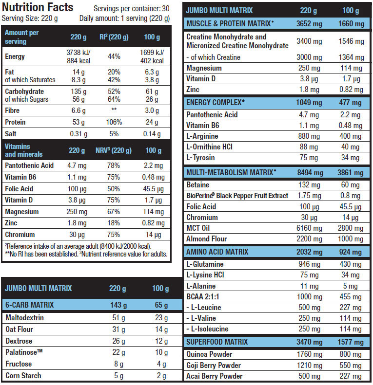Jumbo delivers a combination of whey protein concentrate, carbohydrates and active ingredients that help cover the increased needs of physically active people. The formula includes creatine monohydrate to support physical performance during high-intensity exercise, L-arginine and L-glutamine to aid in muscle recovery, and a full vitamin and mineral complex to contribute to overall metabolic support. The product is intended for individuals with fast metabolism or those in bulking phase.