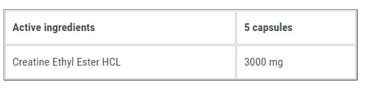 The product contains Creatine Ethyl Ester HCl, a modified form of creatine that includes an ester group, aiming to improve absorption and reduce water retention compared to regular creatine monohydrate. This may support better creatine uptake by muscle tissue, aiding in strength, energy output, and recovery without common bloating.