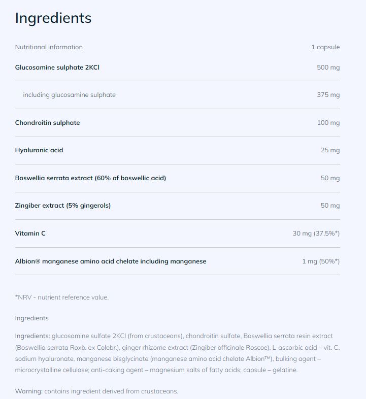 Ingredients: Glucosamine sulphate 2KCl, chondroitin sulphate, Boswellia serrata extract (65% boswellic acid), ginger extract (5% gingerols), MSM, hyaluronic acid, vitamin C, BioPerine® black pepper extract, bulking agents, capsule shell (gelatin), anti-caking agents.