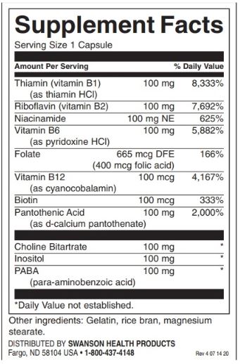 Ingredients: Thiamin (as thiamin HCl), Riboflavin, Niacinamide, Vitamin B6 (as pyridoxine HCl) , Folate (400 mcg folic acid), Vitamin B12 (as cyanocobalamin), Biotin, Pantothenic Acid (as d-calcium pantothenate) , Choline Bitartrate, Inositol, PABA