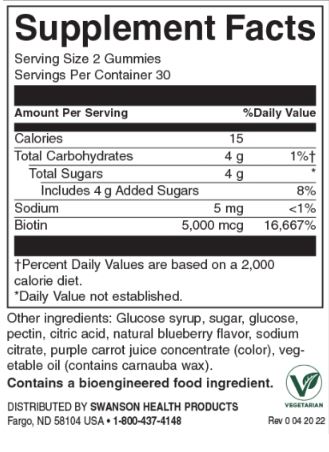Biotin Gummies Blueberry 2500 mcg from Swanson support healthy hair, skin and nails in a tasty, convenient gummy format.