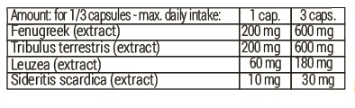 Tribulus terrestris extract, Leuzea extract, Cumin extract, Mursal tea extract, Trigonelline, Ecdysterone.