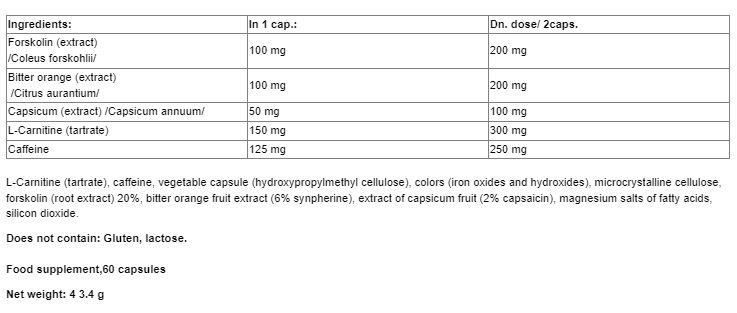 Ingredients: L-Carnitine, caffeine, forskolin, bitter orange