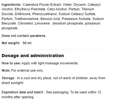 Ingredients: Calendula flower extract, water, glycerin, cetearyl alcohol, ethylhexyl palmitate, cetyl alcohol, fragrance, titanium dioxide, dimethicone, phenoxyethanol, sodium cetearyl sulfate, fragrance, triethanolamine, benzoic acid, potassium sorbate, sodium benzoate, citronellol, limonene, disodium phosphate, potassium phosphate.