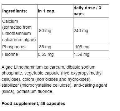 Oligoalgae Oseolife contains Calcium, Phosphorus, algae Lithothamnium calcareum, and Zinc. Calcium is an essential mineral for building and maintaining healthy bones and teeth. Phosphorus works synergistically with calcium and also supports energy production in cells.