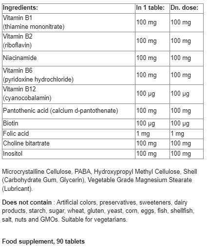 The main ingredients—Vitamin B1 (thiamine mononitrate), B2 (riboflavin), Niacinamide, B6 (pyridoxine hydrochloride), B12 (cyanocobalamin), Pantothenic acid, Biotin, Folic acid, Choline bitartrate, and Inositol—work together to support cellular energy production, nerve function, and metabolic processes. These vitamins also help maintain healthy skin, hair, and immune function.