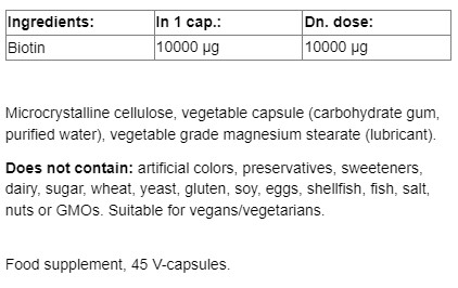 Ingredients: Biotin, microcrystalline cellulose, vegetable capsule (carbohydrate gum, purified water), vegetable grade magnesium stearate.
