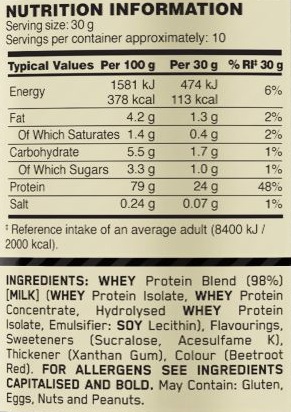 Ingredients: Protein Blend (Whey Protein (Milk) Isolates [contains Emulsifier: Soy Lecithin], Whey Protein (Milk) Concentrate, Whey Peptides (Milk)), Fat-Reduced Cocoa Powder, Flavourings, Creamer (Vegetable Oil, Maltodextrin, Milk Protein), Salt, Sweeteners (Acesulfame Potassium, Sucralose), Thickener (Cellulose Gel) Enzyme Complex (Amylase, Protease, Cellulase, Beta-D-Galactosidase, Lipase).