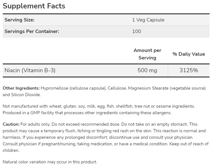 Niacin /Vitamin B-3/ 500 mg / 100 Vcaps