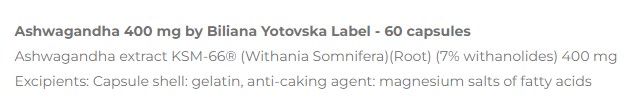 Biliana Yotovska label Ashwagandha 400 mg / 60 Caps
