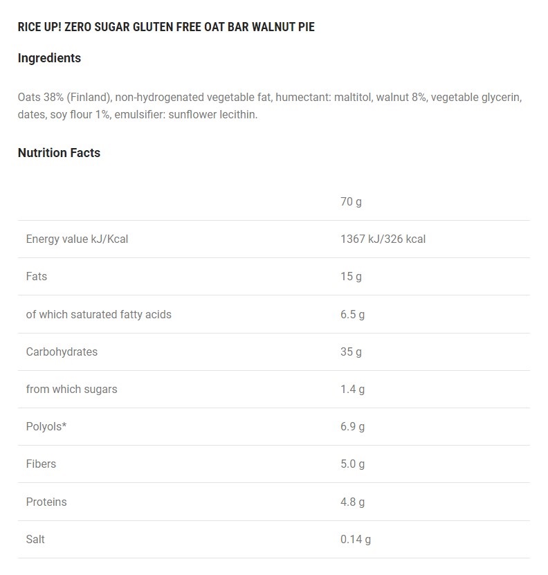 Ingredients: Oats (38%), non-hydrogenated vegetable fat, maltitol, walnut (8%), vegetable glycerin, dates, soy flour, sunflower lecithin