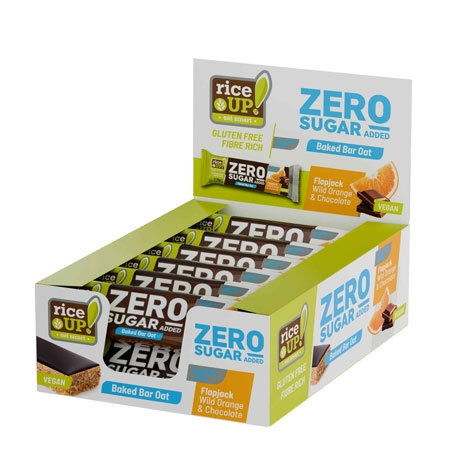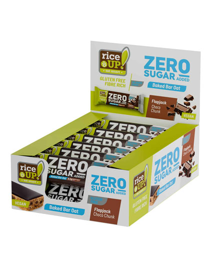 Zero Sugar Flapjack Choco Chunk from Rice Up is a gluten-free oat bar with chocolate pieces, created without added sugar and suitable for active lifestyles.
